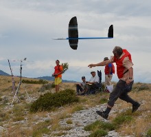 V pondělí se lítalo na jižní straně. Odlítaly se krásný čtyři kola. Mě se povedl neuvěřitelný, přímo „husarský kousek“! V šestém kole mi Richard hodil na startu éro jako vždycky a já jsem už jen mohl sledovat, jak se můj Stinger řítí střemhlav do údolí, protože jsem ho zapomněl zapnout! Éro zmizelo dole pod skálou a ozvala se tlumená rána. Když jsem si slezl dolů pro trosky letadla a našel místo dopadu, nevěřil jsem vlastním očím! Stinger byl píchnutý do šípkového keře. Až na díru u kořene křídla mu nic nebylo! A protože mě čekala ještě soutěž v Brianconu, nepohrdl jsem plechovkou od Richarda, abych mohl éro provizorně opravit.