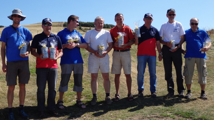 Ve čtvrtek ráno v šest hromadu mých věcí na dvorku polyká Vaškův "turek" (Ford Custom) a míříme na západ, Prahou projíždíme ještě před nehodou na okruhu a přibrzdí nás jen opravy německých dálnic. Ve 14h krátká obchodní zastávka za Karlsruhe a jeden šťastný majitel Dinga, míříme dál a překračujeme Rýn, abychom začali stoupat do hor, bohužel navigace nás chce protáhnout cestami tak pro lesní traktory a tak po chvíli dobrodružství s hledáním slepých uliček přijíždíme na určené parkoviště ve výšce cca 1300m n.m. a už z dálky vidíme hemžení letadel na svahu. Fouká krásně západní vítr přes 10m/s, tak létáme a ladíme, ve vzduchu je pořád několik letadel, užíváme si větru a možnosti naložit a přesto bezpečně přistát na prostornou pastvinu do vřesu a borůvčí. Bohužel já pohřbívám své naděje havárií Sonixe díky použití špatné spojky. Čekal jsem všechno možné, ale tohle pořád nemůžu překousnout, tolik jsem si od jeho premiéry sliboval a takhle to zazdím. Nakonec odcházíme z kopce poslední, nemáme kam spěchat, v plánu je opékání špekáčků a dva soudky "poličky", což bez problémů realizujeme a jdeme na kutě. Vítr stále fičí, celou noc až do rána a nepřestává, jen občas se přidá drobná přeháňka. Snažíme se uvařit vodu a snídáme, pořadatelé před devátou přijíždějí a registraci máme přímo před naším autem, luxusní. Bez velkých formalit vyrážíme na kopec, brífink a začíná soutěžní klání. První kolo letíme časy okolo 45s., při stoupání se dotýkáme mraků a éro se začíná ztrácet v oparu, zvykáme si na pořadí startujících (bylo na každý den rozlosováno předem a úplně jinak), v dalším kole už se přiostřuje a časy míří pod 40s. nastává to správné soutěžní hecování. Ve čtvrtém kole všechny deklasuje Rondel svými 33s. Bohužel máme podezření, že u zvoníků jsme si všichni rovni, on je však "rovnější". V dalších kolech se při jeho letu občas někdo postaví na bázi pro kontrolu, ale protest nikdo nepodá. Odpoledne začne vykukovat sluníčko, už odkládáme kulichy a rukavice, vzduchy někomu přicházejí lepší, někomu horší. Francouzi během soutěže sedí pospolu, vzájemně si fandí a při lepším výkonu povzbuzují a tleskají . Když si jejich primadonu odmění potleskem i za čas 50s, tak zkoušíme podobnou taktiku. Vaškův čas 47s. odměníme jásotem a poté mexickou vlnou. To už Francouzi značně znejistěli, kolik to vlastně letěl a udiveně se na nás dívají. Jejich psychologickou sílu jsme značně nabourali a nám je líp, chechtáme se jak malí kluci. Pořadatelé prodloužili letový den o jednu hodinu, což vzhledem k podmínkám a předpovědi všichni odsouhlasili potleskem. V posledním kole Radek tlačil na pilu, ale ta bohužel v podobě jeho Pike nedokázala přetnout kmen horského smrčku a tak let skončil uraženým koncem křídla a nulou. Ta ho zřejmě připravila o vítězství, rozletěné to měl pěkně. Možná v práci podá zlepšovák, aby Pike měl okovanou a ostřejší náběžku, tzv. verze Pike Přefiction. Z kopce odcházíme jako poslední, hory večer tichnou a nízké slunce je osvětluje, vychází měsíc a vítr utichá. Okolo jen cinkání zvonců pasoucích se krav. Přesouváme se na druhé parkoviště, abychom ráno byli hned na srazu. Dnes jsou na programu steaky, tak si je užíváme do syta a na spaní nepospícháme, předpověď na sobotu je krásný den bez větru. Filosofujeme na různá témata, např. když se nic neděje, nejsou dějiny apod.